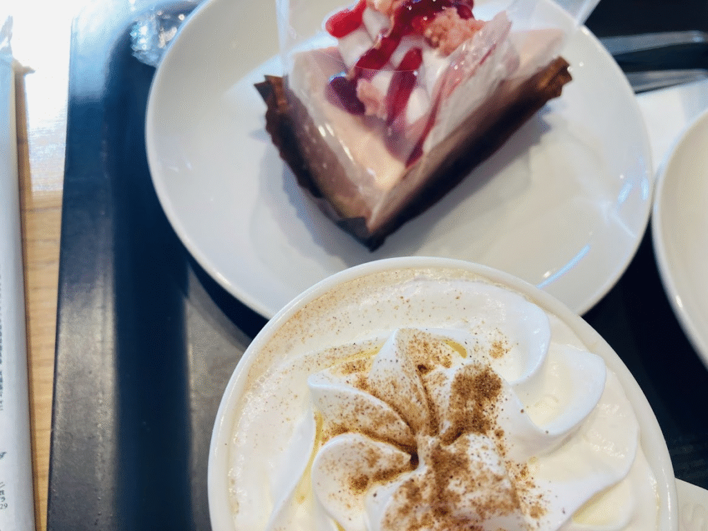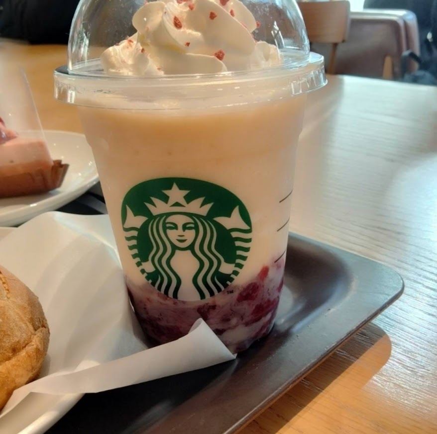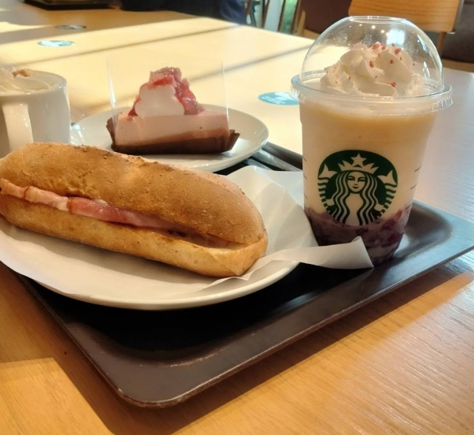 フラペチーノ+石窯フィローネ、ジンジャーブレッドラテ+ストロベリーチーズケーキ。
